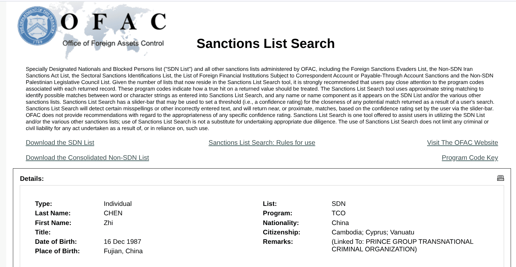 このツールはOFACが提供する公式の無料検索システムで、すべての制裁リストを横断的に検索できます。